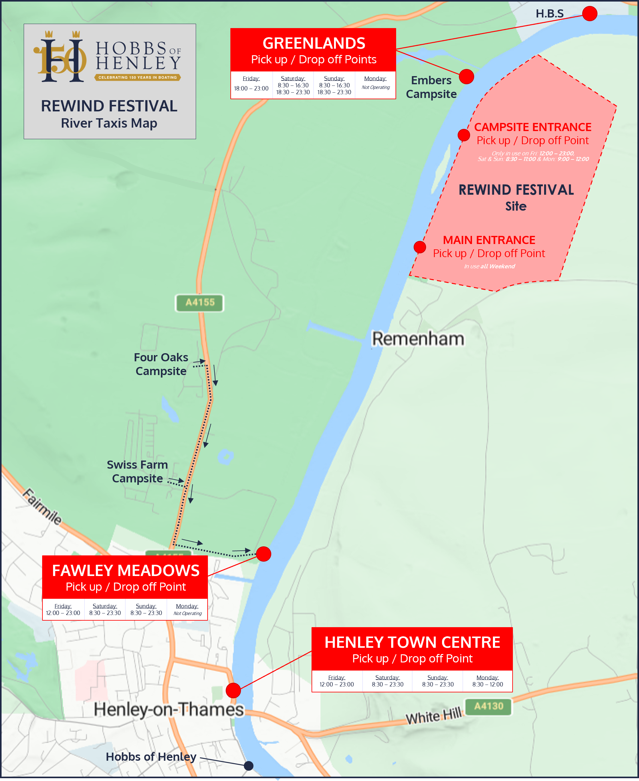 We also operate river taxis to the festival from Fawley Meadows (for Swiss Farm and Four Oaks campers) and Greenlands (for Embers campsite and Greenlands hotel). These services are not operating across the whole weekend so please check the times below.